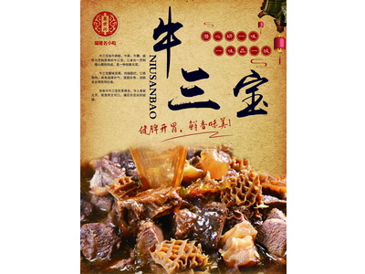 牛三宝是由新鲜上好黄牛身上的牛腱子、牛肚、牛筋通过秘制的配方和细火慢炖熬制而成。过去,想吃上这道汤鲜肉嫩的美食只能来到泉州。随着市场体量的需求,我公司将传统的手工秘方和现代烹饪工艺相结合,研发出真空牛三宝包装,携带方便、操作简单,全国可配送,让喜欢“牛瑞香牛三宝”的小伙伴们可以随时随地都可以品尝到美味。